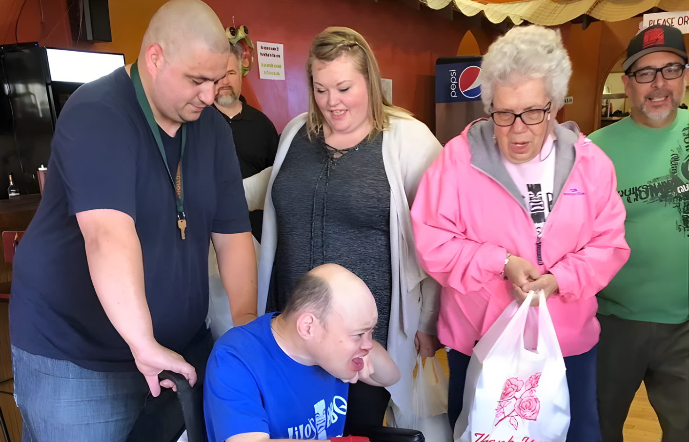 Lilo’s Owner José Ruis (far right) watches on as the Opportunity Connections crew rolls out of Lilo’s for a lunch delivery. Shown here: Opportunity Connections’ Tony Govea and Chelsi Curtis assist Terry Bolton (pink) and “Ted” Carroll (seated) make their way to One Community Health.