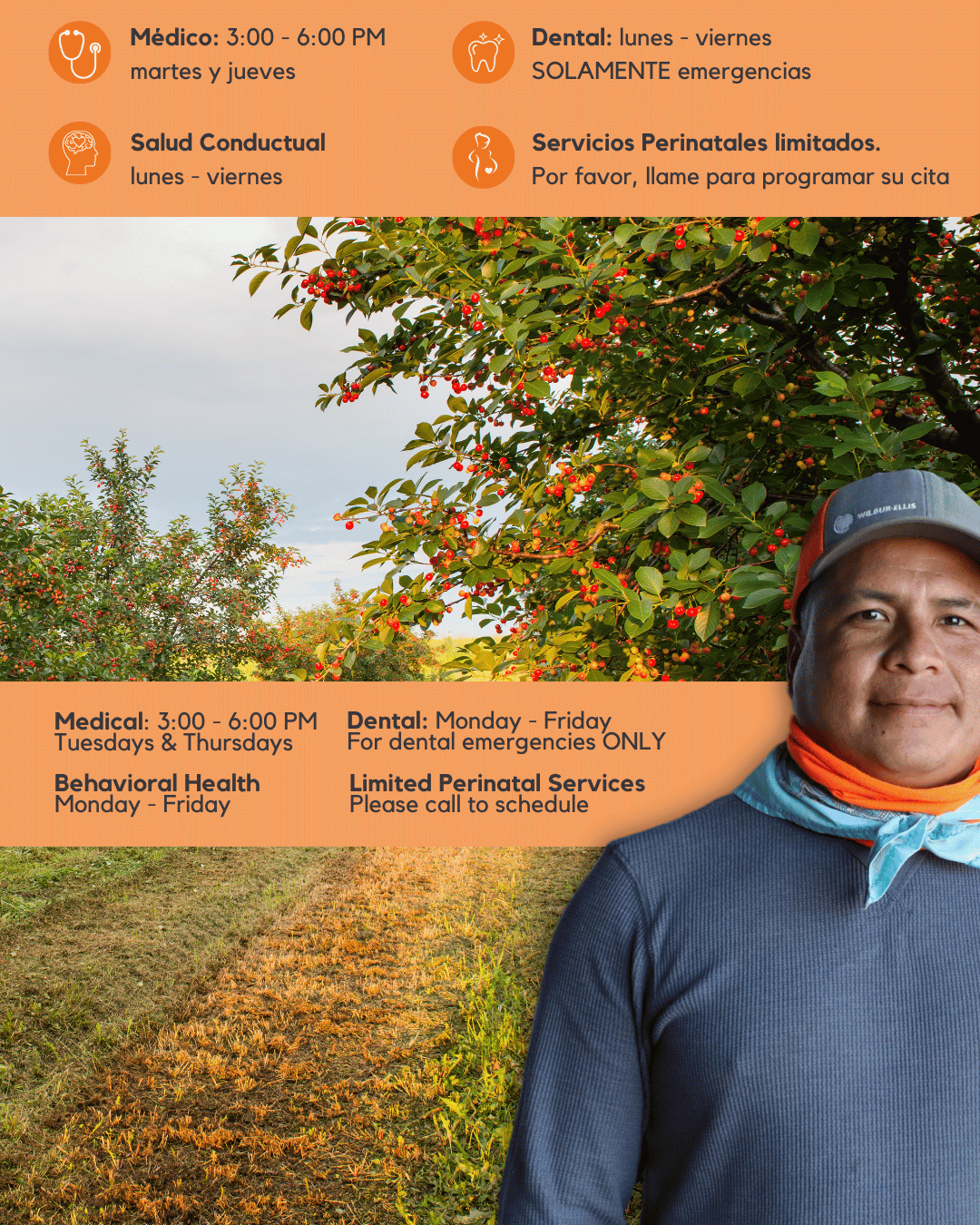 La Clinica offers acute care, chronic disease management, and preventive services—and can visit orchards or central sites by arrangement with our Outreach team.